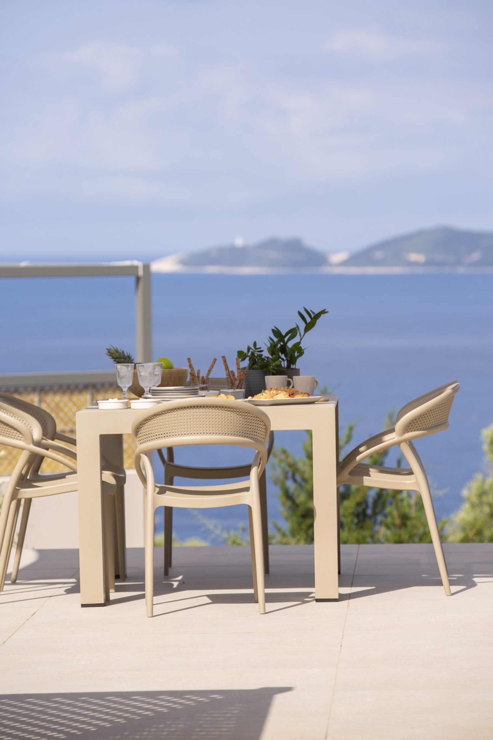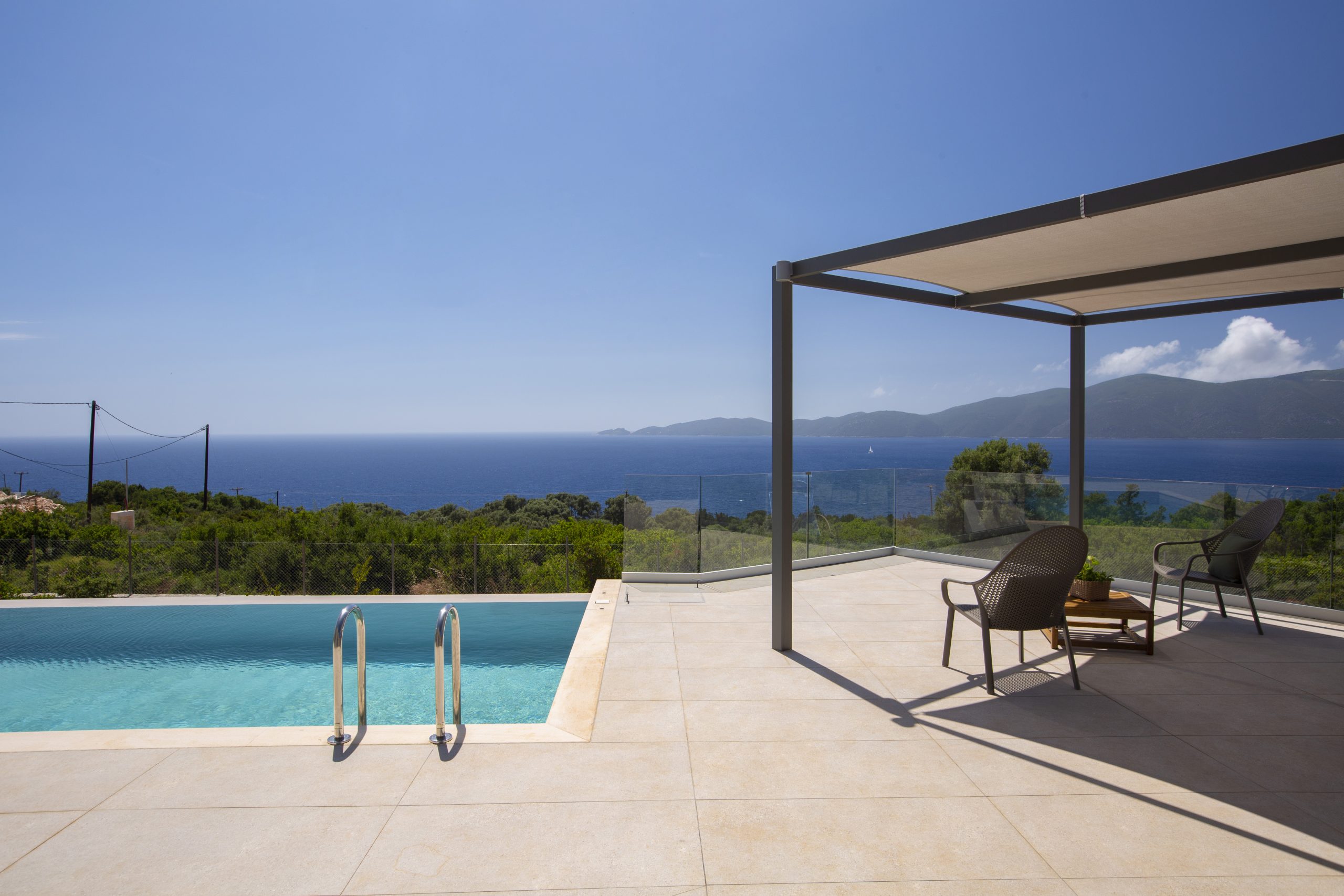 Μια ευρύχωρη βεράντα 175 τ.μ., διαθέτει δύο κιόσκια με σκίαση για να απολαύσετε τον γαλάζιο ορίζοντα δίπλα στην ιδιωτική πισίνα των 8 x3,6 (βάθους 1,5μ.) με υπερχείλιση-καταρράκτη και ενσωματωμένο υδρομασάζ.
