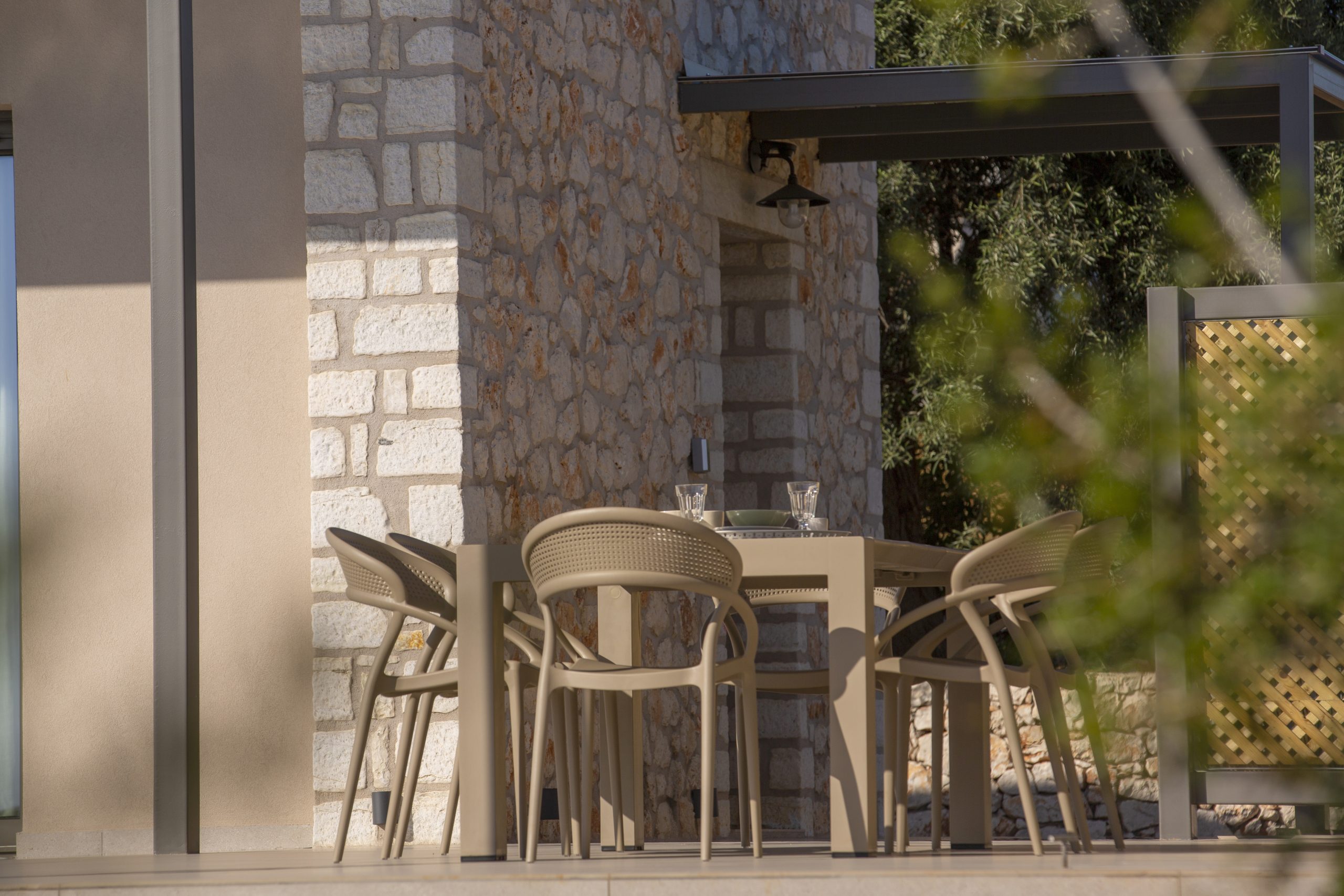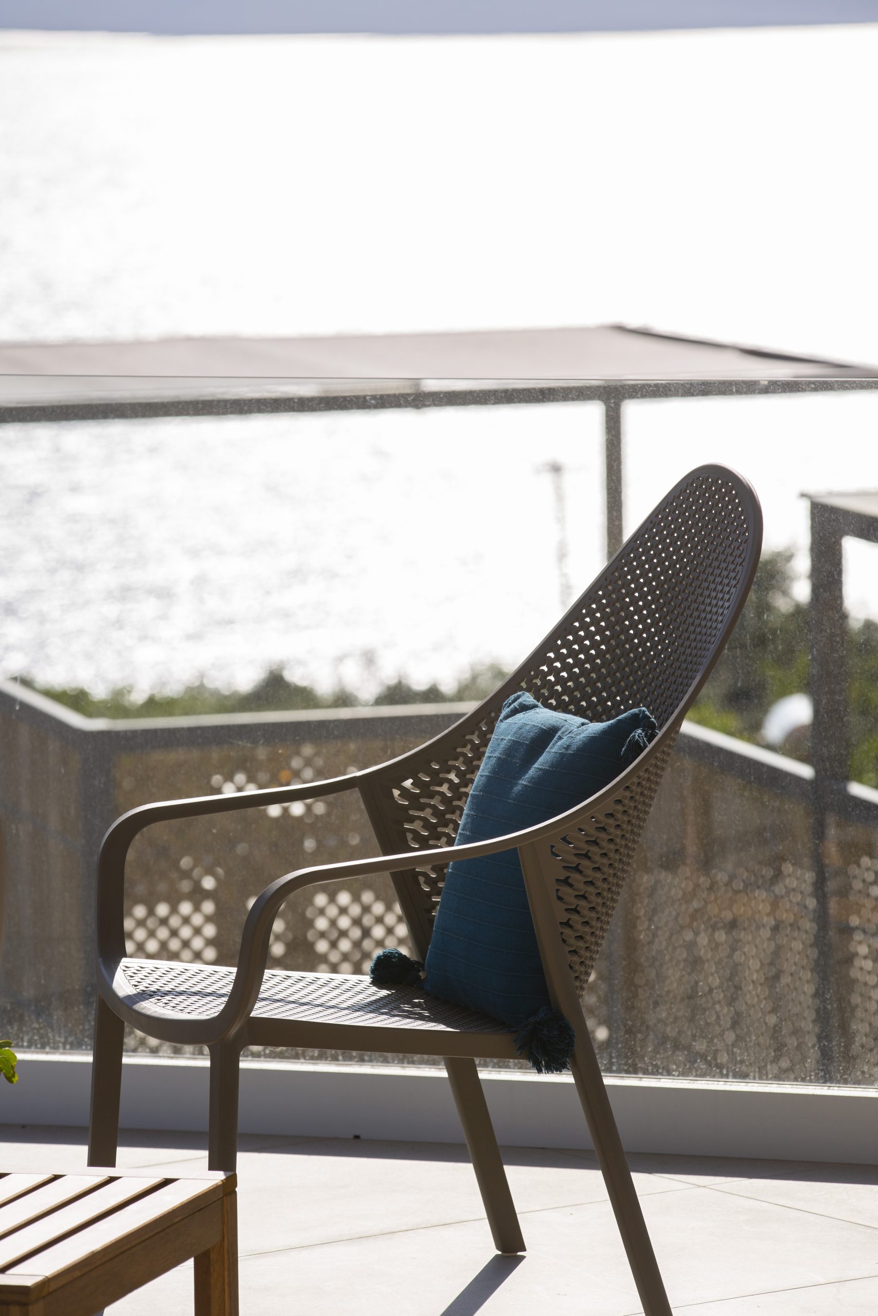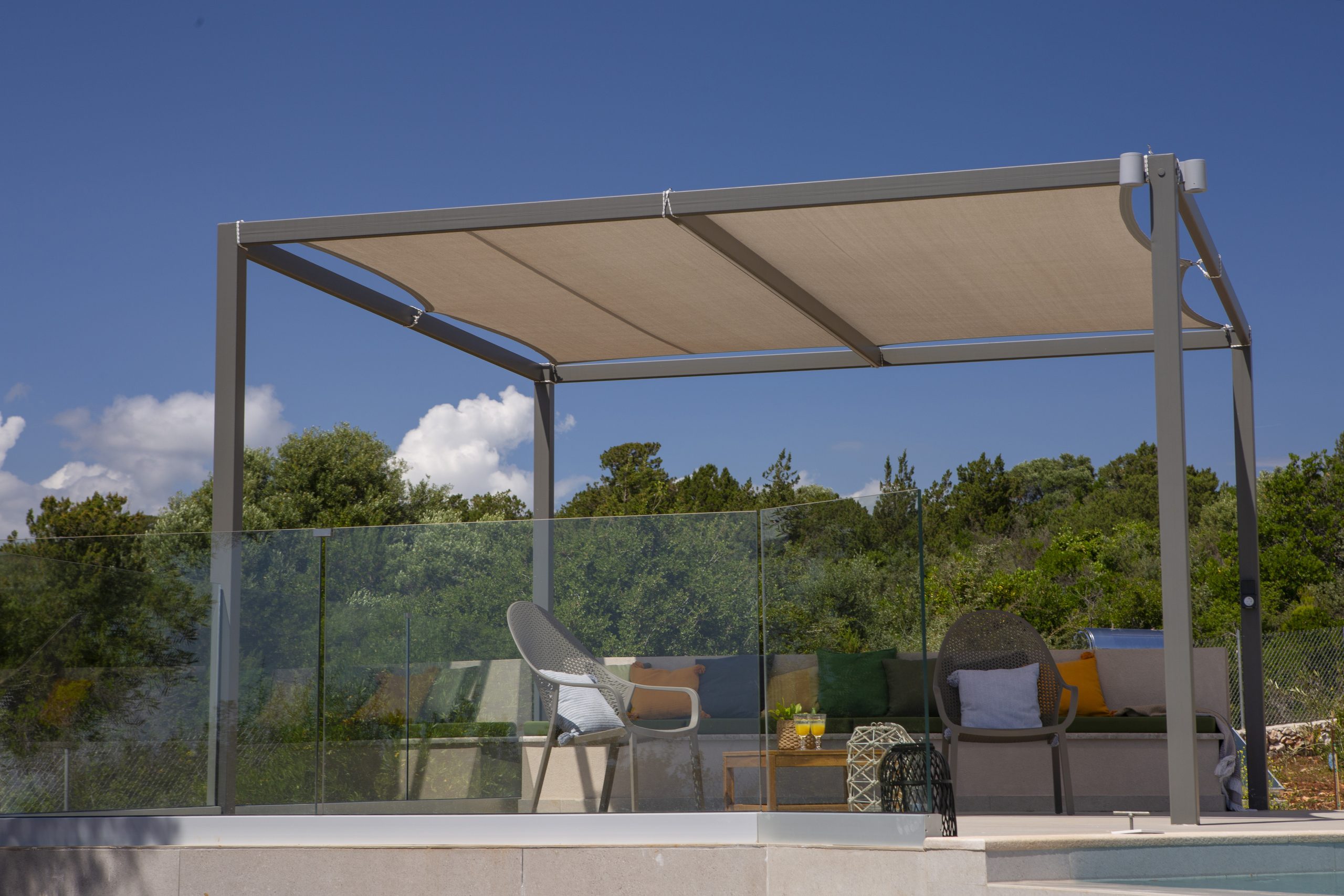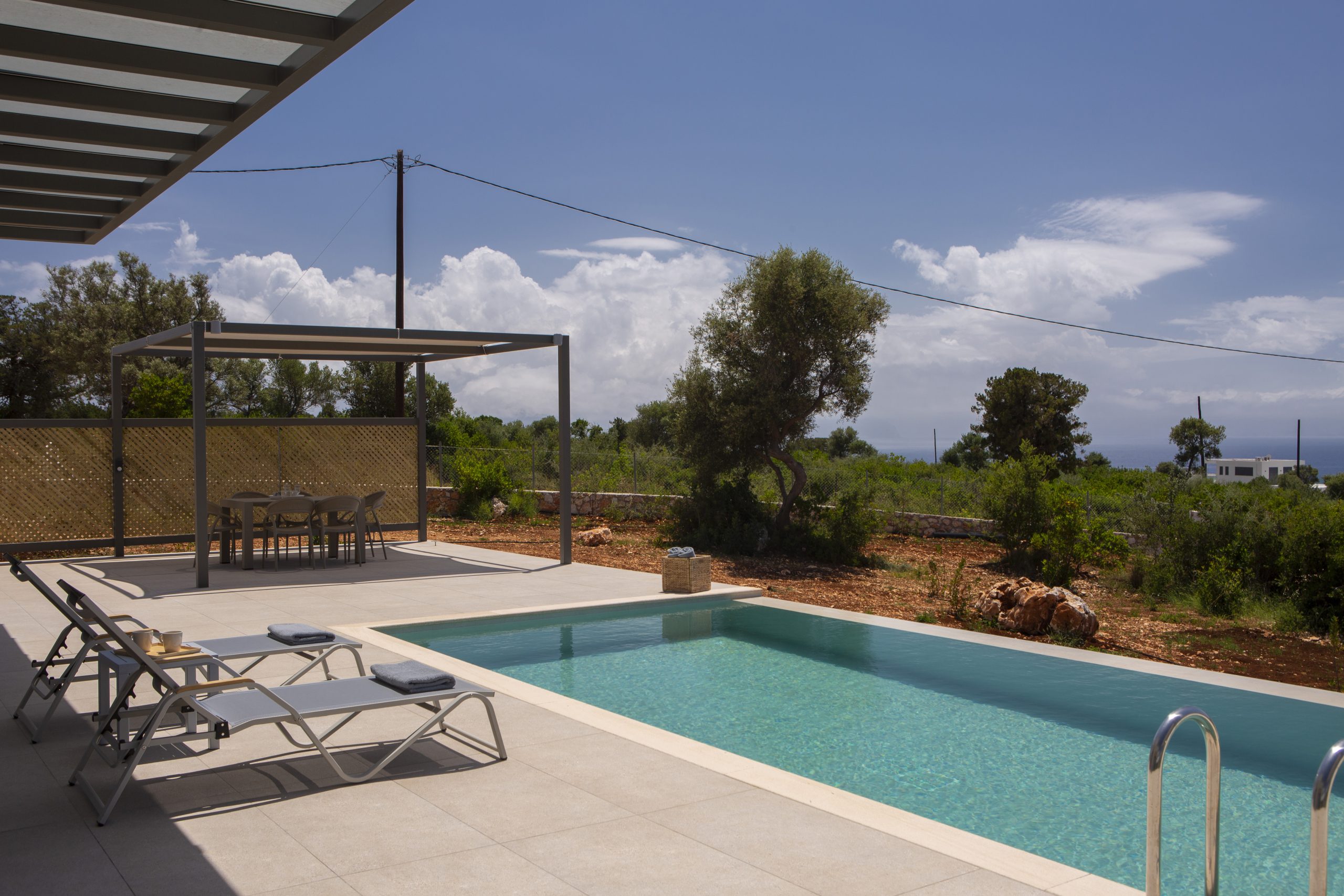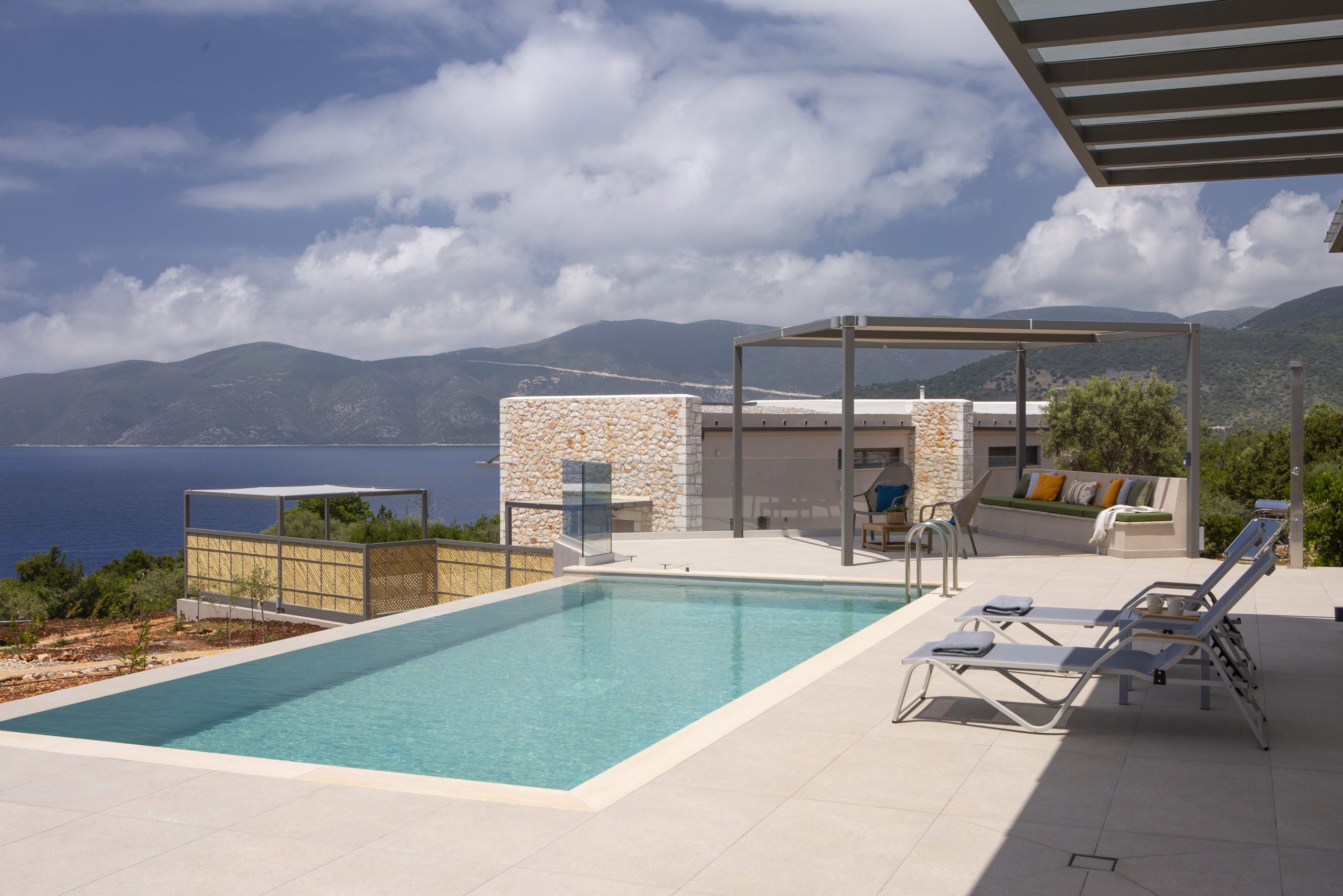 Μια ευρύχωρη βεράντα 175 τ.μ., διαθέτει δύο κιόσκια με σκίαση για να απολαύσετε τον γαλάζιο ορίζοντα δίπλα στην ιδιωτική πισίνα των 8 x3,6 (βάθους 1,5μ.) με υπερχείλιση-καταρράκτη και ενσωματωμένο υδρομασάζ.